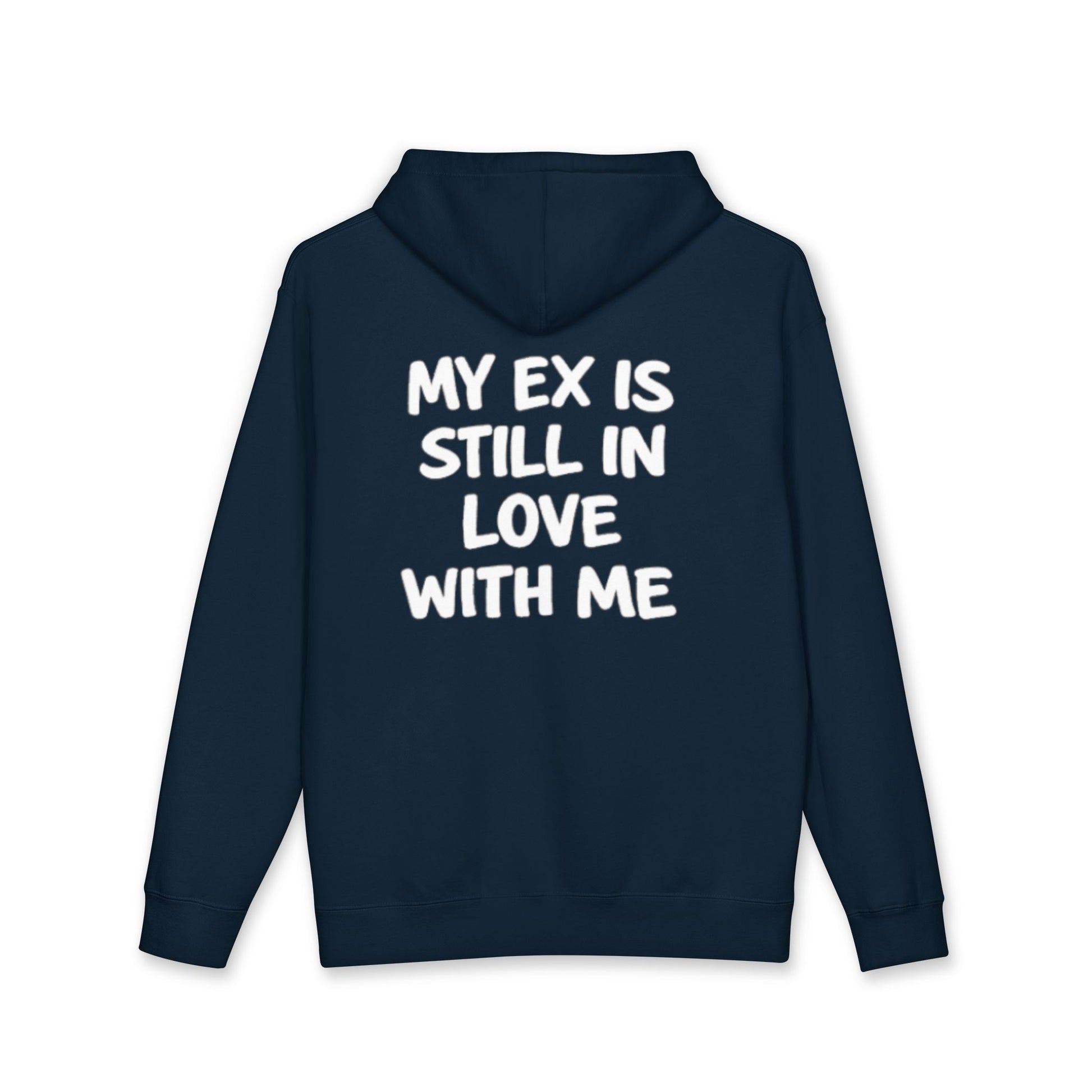 This black hoodie features bold white lettering on the back that reads “MY EX IS STILL IN LOVE WITH ME.” The thick, playful font gives the message a cheeky and confident tone, making it feel humorous and attention-grabbing.